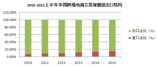 2015年上半年,中國跨境電商的進出口結構出口占比達到84.8%,進口比例15.2%。
