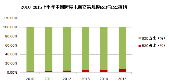 2015年上半年,中國跨境電商的交易模式跨境電商B2B交易占比達到91.9%,跨境電商B2B交易占據(jù)絕對優(yōu)勢,跨境電商B2C交易占比8.1%。